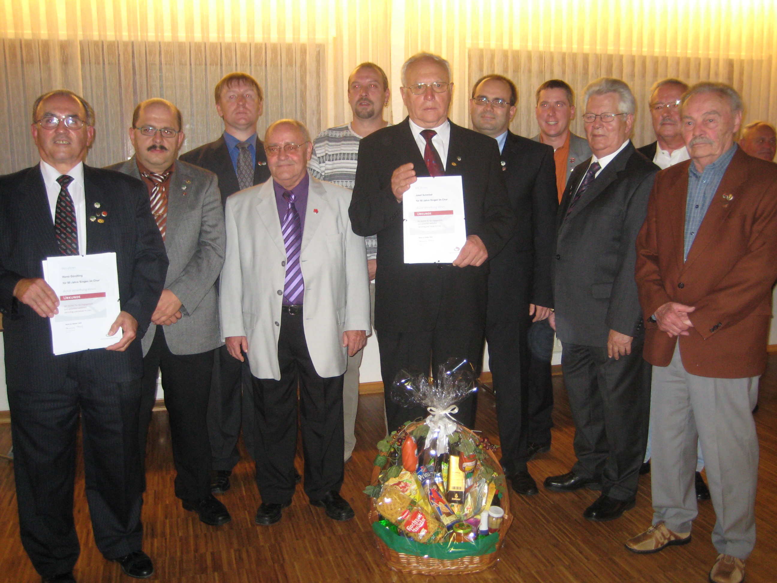 Bevor Ohl zusammen mit dem Kreisrechner des Sängerkreises Bergstraße, Thomas Schröder, zur Mitgliederehrung überging, wollte Letzterer noch ein paar Worte loswerden. Nach einer kurzen Begrüßung bedankte er sich unter anderem im Namen des Sängerkreises Bergstraße für die jahrelange Unterstützung des Vereins. Zudem ließ es sich Schröder nicht nehmen, Grüße seitens des Ersten Kreisvorsitzenden, Heinz Ritsert, auszurichten und den Verein in höchsten Tönen zu loben. Momentan zählt der MGV 1902 329 Vereinsmitglieder, darunter 23 Jubilare, die im Rahmen des diesjährigen Familienabends geehrt wurden. 16 von ihnen waren anwesend – die Jubilare erhielten ihrer Mitgliedschaftsdauer (25, 40, 50 oder gar 60 Jahre) entsprechend, diverse Präsente. Neben verschiedenen (Ehren-)Urkunden, Präsentkörben, Weinflaschen und Gläsern erhielt jedes Mitglied eine Anstecknadel des MGV 1902 oder des Hessischen Sängerbundes, für 60-jährige Vereinstreue sogar einen Ehrenteller. Besonders hervorgehoben wurden die Ehrungen zweier aktiver Mitglieder. Beide gehören dem Verein seit 60 Jahren an. „Es freut mich ganz außerordentlich, diese zwei Herren zu ehren“, sagte Ohl. Sowohl Reimund Deutsch als auch Herbert Held erhielten neben ihren Geschenken noch eine spezielle Urkunde vom Deutschen Chorverband, versehen mit dem Dank für ihr jahrelanges Engagement.