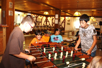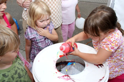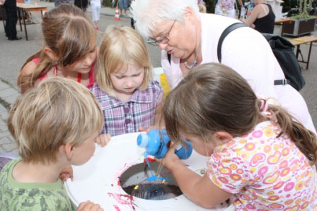 Spaß – auch ohne Sonnenschein. Die älteren Kinder trafen sich zum Tischfußball-Turnier. Gemeinsam entlockte man der sich drehenden ColorSpin-Trommel Farbkunstwerke, die von der Fliehkraft auf das Papier