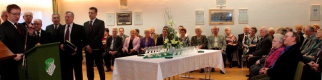 „Enorme Lebensleistung“29.10.2012 - BÜRSTADT Von Wolfgang Behne FAMILIENABEND MGV 1902 ehrt Mitglieder / Hans Massoth seit 60 Jahren aktiver Sänger Gut gefüllt war das Vereinsheim des Männergesangvereins 1902 am Samstagabend, als die Sänger ihren Familienabend feierten. Dieser wurde wegen des Freundschaftssingens Anfang Oktober um drei Wochen verschobenen. „Daher haben wir in diesem Jahr unseres 110-jährigen Bestehens unsere traditionelle Nachkerwe inklusive Kerwekranzaufhängung wegfallen lassen“, erklärte Klaus Ohl den Vereinsmitgliedern zu Beginn seiner Begrüßungsrede. Der Erste Vorsitzende ging in einem kurzen Jahresrückblick auf die Höhepunkte der letzten zwölf Monate des Vereinsgeschehens ein und ließ sie pointiert Revue passieren. Eingerahmt in mehrere Liedvorträge des Chors - unter der musikalischen Leitung von Helmut Vorschütz -, nahmen die Ehrungen von insgesamt 13 aktiven und fördernden Mitgliedern breiten Raum im Abendprogramm des „Ausklangs des Vereinsjahres“ ein. Gemeinsam mit dem Ersten Vorsitzenden des Sängerkreises Bergstraße, Heinz Ritzert, ehrte Klaus Ohl verdiente Vereinsmitglieder und durfte die entsprechend der jeweiligen Zugehörigkeitsdauer unterschiedlichen Urkunden, Vereinsnadeln und Weinpräsente überreichen. Besonders herausgehoben und gewürdigt wurde dabei Hans Massoth, der seit 1952 dem MGV 1902 in ununterbrochener Folge als aktiver Sänger angehört. „Ein außerordentliches Jubiläum und eine enorme Lebensleistung“, waren sich die Laudatoren und alle Vereinskameraden einig und belohnten den Jubilar mit den besten Wünschen und lang anhaltendem Beifall. Eine weitere Ehrung und besondere Auszeichnung durch den Sängerkreis Bergstraße für Massoth schloss sich an. Eine besondere Ehre wurde auch Jochen und Kurt Lenhart zuteil. Beide gehören seit nunmehr 50 Jahren ihrem Verein als fördernde Mitglieder an und wurden, nach einem entsprechenden Beschluss der Jahreshauptversammlung, zu „Ehrenmitgliedern auf Lebenszeit“ ernannt. Neben den Ehrungen und Gesangseinlagen sorgten Organist Oskar mit Tanzmusik und eine Tombola dafür, dass der Familienabend für alle Jubilare, Sänger und Vereinsmitglieder eine „runde Sache“ war, die bis weit in die kalte Oktobernacht andauerte.