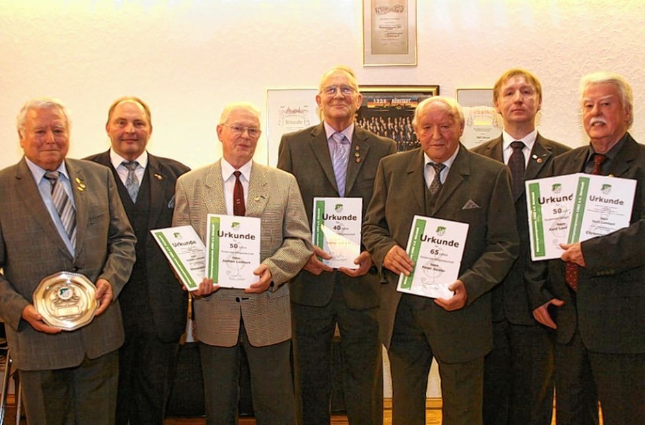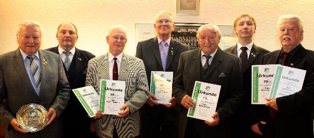 Ehrung beim MGV 02: Hans Massoth (v.l.), Heinz Ritsert, Jochen Lenhart, Georg Lederer, Peter Dexler, Klaus Ohl und Kurt Lenhart. Foto: © jkl Südhessen Morgen, Dienstag, 30.10.2012